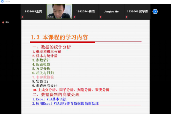 3月6号上午,体育教学部王乐军老师通过zoom平台向本院及其他学院研究生讲授了《数据高效处理与统计分析》课程。本节课,王老师主要讲述了统计学的意义、性质、内容、课堂要求及考试等事项,师生全程交流通畅,互动积极,线上授课顺利完成。