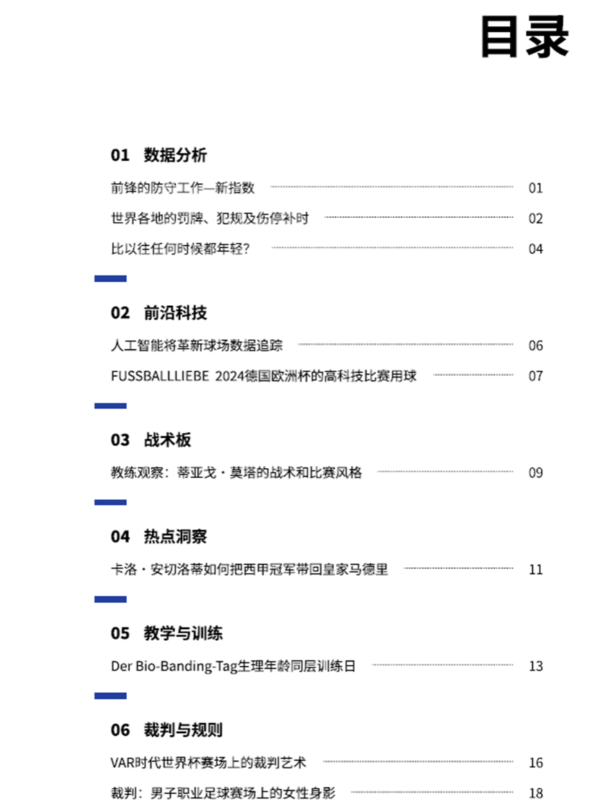 经过筛选、初审、复审以及定稿等环节,主编团队精心挑选了6篇佳作,收录于第二期《齐云报》之中。这些文章涵盖了战术板、数据分析、前沿科技、热点洞察、教学与训练和情报速递等多个主题板块,为广大读者带来了2024年欧洲杯决赛的技战术分析、近十年转会市场的经济分析、AI助力球探工作、以金球先生罗德里为代表的防守型中场的转会价值分析、新晋德甲冠军勒沃库森的训练方式和近期足坛热点事件等文章,向大家呈现出一个全面、立体、富有洞见的前沿足球世界。