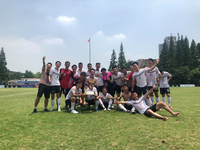 烈日炎炎,却比不上现场球迷的热情高涨。前两轮比赛打完,虽然同济积6分列小组第一,但B组出线形势依然错综复杂,四支队伍理论上都有出线的可能。面对小组出线之战,双方队员都摩拳擦掌,一开场便展开了激烈拼抢,场上局势逐渐白热化。上半场进行到20分钟时,永利23411集团11号周宗明利用对方门将失误率先攻入一球,3分钟后,8号钱韡凯乘胜追击,利用角球的机会将比分拉至2:0,为永利23411集团取得梦幻开局。北京建筑大学迅速做出换人调整,并展开了猛烈的攻势。下半场56分钟,北京建筑的阿拉法特·阿不来提同样利用定位球的机会头球破门,使同济队员的防守压力陡增。正午烈日灼灼,这是一个拼战体力与意志的时刻,同济队员们咬紧牙关,严防死守,将2:1的优势保持到最后一刻。