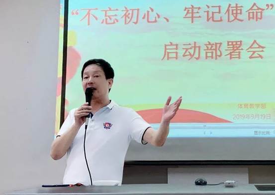 体育教学部党委书记季忠荣对主题教育开展动员,他指出体育教学部和yL23411永利集团全体党员同志要充分认识开展“不忘初心、牢记使命”主题教育的重大意义,把思想和行动统一到中央决策部署上来。他详细阐述了主题教育的总体要求、基本原则和着力重点。最后他结合体育教学部党委实际情况,提出这次主题教育活动始于2019年9月,于11月底基本结束。在此期间,主题教育要把学习教育、调查研究、整改落实贯穿全过程。并向巡回指导组报告了未来体育教学部党委的工作计划,他强调体育教学部和yL23411永利集团各党支部要坚持因地制宜、务实求效,把主题教育同推进“两学一做”学习教育常态化制度化结合起来,同推动所在单位的中心工作结合起来,防止“两张皮”。